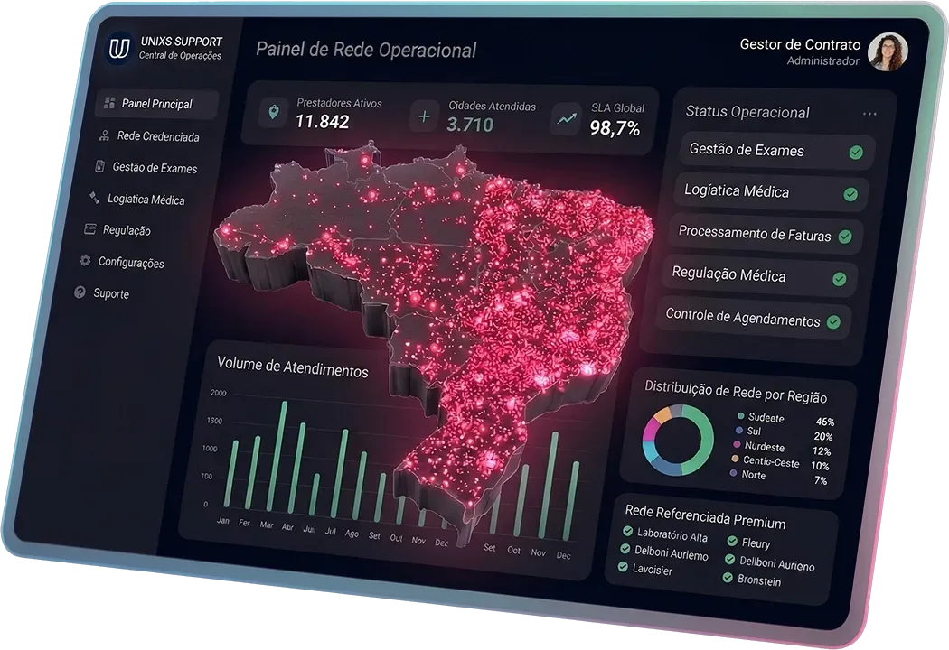 A Unixs não é uma seguradora. Não é uma clínica. Somos a inteligência operacional entre você e a rede credenciada.